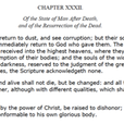 This seventeenth century doctrinal statement: "Of the State of Man After Death and of the Resurrection of the Dead" is found in the 1646 Westminster Confession of Faith online. Click on the link above the image for their entire doctrinal statement and their seventeenth century perspective on the Holy Bible. Note: I have not read or studied all of the Westminster Confession of Faith statement and have no further opinion of it at this time.